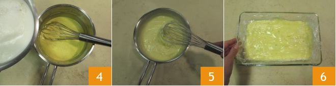 Une fois que le lait et la crème seront chauds, retirez la gousse, versez sur le mélange de jaunes 4 et mélangez bien. Ensuite, remettez le tout sur le feu doux pour épaissir la crème, en remuant pour éviter que la crème ne colle au fond. Lorsque la crème sera épaisse, retirez du feu et mélangez énergiquement pendant quelques instants 5, puis transférez la crème dans un plat large et bas en couvrant avec un film plastique au contact 6. Laissez refroidir d'abord à température ambiante, puis au réfrigérateur.