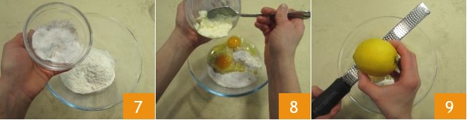 Consacrez-vous à la pâte des castagnoles : dans un bol, versez la farine et la levure tamisées, ajoutez aussi le sucre avec les graines d'une gousse de vanille 7. Versez les œufs et le beurre mou 8. Râpez le zeste d'un demi-citron 9.