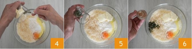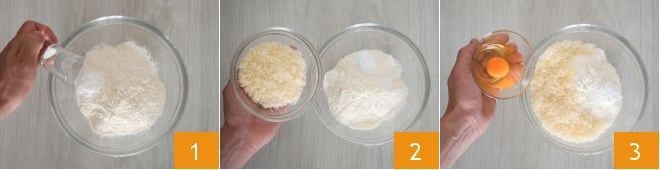 Pour préparer les castagnoles salées au romarin, versez la farine dans un grand bol, ajoutez la levure instantanée 1, le parmesan râpé 2 et l'œuf 3,