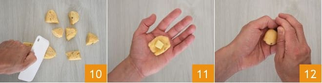 Après le temps de repos, divisez la pâte en petites portions d'environ 12 g chacune 10. Aplatissez chaque morceau de pâte dans la paume de votre main et placez un cube de provola au centre 11, puis refermez la pâte et formez une boule 12.
