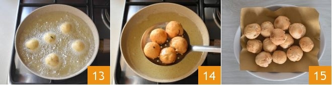 Chauffez l'huile de graines dans une petite casserole jusqu'à atteindre une température de 160°-170° et faites frire quelques castagnoles à la fois pendant quelques minutes 13. Lorsqu'elles sont bien dorées, égouttez-les avec une écumoire 14 et transférez-les sur du papier absorbant. Terminez la friture et servez vos castagnoles salées au romarin 15 !