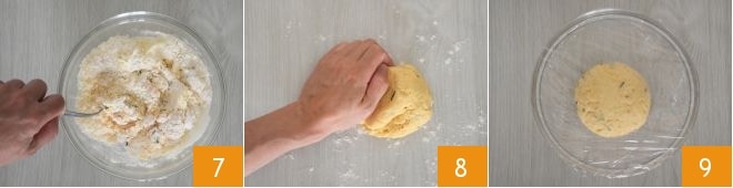 Commencez à mélanger la préparation avec une fourchette 7, puis transférez-la sur un plan de travail légèrement fariné et travaillez à la main pendant environ 5 minutes jusqu'à obtenir une pâte homogène 8. Remettez la pâte dans le bol, couvrez de film plastique 9 et laissez reposer au réfrigérateur pendant 30 minutes. Pendant ce temps, coupez la provola en dés : il vous en faudra environ une trentaine.