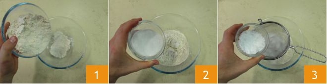 Pour préparer les castagnotti, commencez par mélanger les poudres dans un récipient. Donc farine de châtaigne 1, farine de riz 2, mettez un tamis et versez le sucre glace 3,