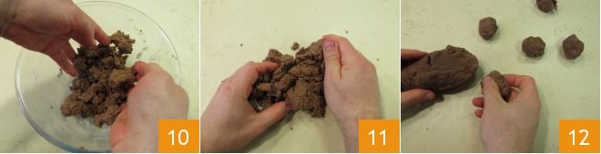 Continuez à pétrir jusqu'à ce que la pâte soit compacte 10, transférez-la sur le plan de travail et pétrissez encore un instant pour rendre l'ensemble homogène 11. Préchauffez le four et en attendant, prélevez des morceaux de pâte pour obtenir 25 boules d'environ 15 g chacune 12.