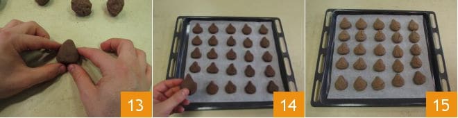 Modelez-les pour obtenir une sorte de goutte 13, dont la base est arrondie et large tandis que la pointe est plus étroite et fine. Disposez-les sur une plaque à pâtisserie 14 et faites cuire en mode statique à 200° pendant environ 9-10 minutes 15.