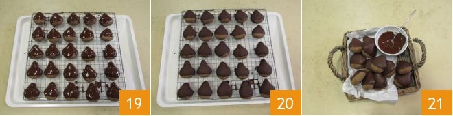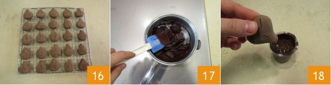 Une fois cuits, laissez-les refroidir complètement sur une grille 16. Faites fondre le chocolat au bain-marie 17, versez-le dans un verre étroit et plongez les biscuits en laissant la base découverte, comme s'il s'agissait d'une châtaigne 18.