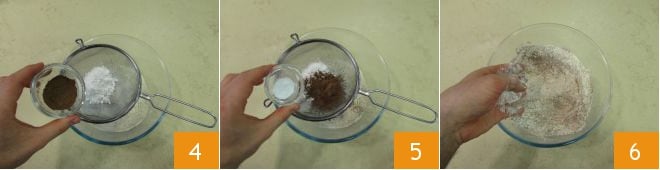 le cacao amer en poudre 4 et le bicarbonate 5. Mélangez avec les mains pour homogénéiser 6,