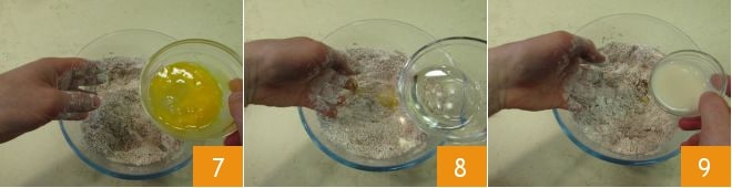 puis ajoutez les œufs 7, l'huile 8 et le lait 9.
