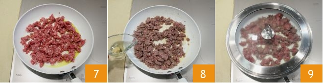 Émiettez-la 7, mélangez et faites revenir quelques minutes, puis déglacez avec le vin blanc 8, laissez évaporer et poursuivez la cuisson avec le couvercle 9.