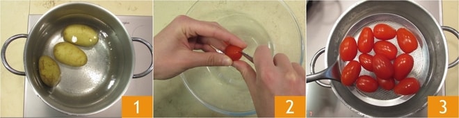 Pour réaliser les cavatelli de pommes de terre avec tomates cerises et ricotta, commencez par faire cuire les pommes de terre pour la préparation des cavatelli 1; cela prendra 30-40 minutes selon la taille, jusqu'à ce que vous puissiez facilement les percer avec une fourchette. En attendant, préparez la sauce : lavez et séchez les tomates cerises, puis avec la pointe d'un couteau, incisez la peau d'une des extrémités 2. Portez à ébullition une casserole d'eau et blanchissez les tomates cerises pendant environ 30 secondes 3.