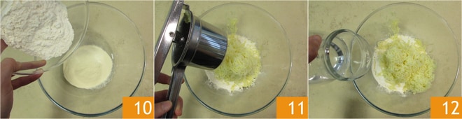 Quand les pommes de terre sont cuites, mélangez la semoule et la farine dans un bol 10, puis ajoutez les pommes de terre écrasées (la peau restera à l'intérieur du presse-purée) 11 et l'eau 13.