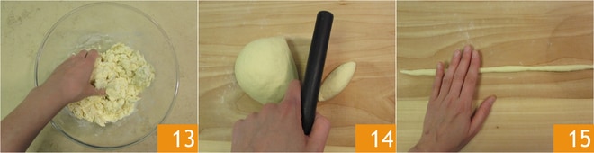 Commencez à pétrir avec les mains 13, puis transférez la pâte sur une planche et continuez à travailler jusqu'à obtenir une pâte lisse et homogène. Divisez la pâte en petites portions à l'aide d'un coupe-pâte 14 et étalez-les avec le bout des doigts sur un plan légèrement fariné pour former des cordons d'environ 1 cm d'épaisseur 15.