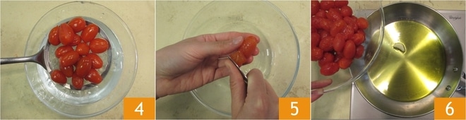 Égouttez les tomates cerises et plongez-les dans un bol d'eau glacée 4, puis retirez leur peau 5. Dans une poêle, faites revenir brièvement l'ail dans l'huile, puis ajoutez les tomates cerises entières pelées 6.
