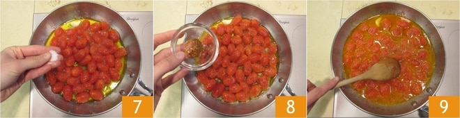 Ajoutez le sel 7 et le piment 8 et faites cuire à feu vif pendant 20 minutes, en ajoutant un peu d'eau si nécessaire et en écrasant les tomates les plus grosses avec la louche 9.
