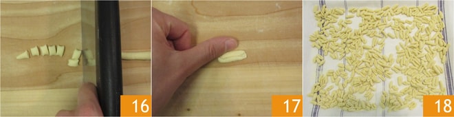 Coupez les cordons en morceaux de maximum 2 cm de longueur 16. Avec le pouce, appuyez sur chaque morceau de pâte du côté de la coupe et faites-le glisser sur la planche de bas en haut pour créer la forme concave typique 17. Au fur et à mesure qu'ils sont prêts, disposez les cavatelli sur un torchon légèrement fariné 18.