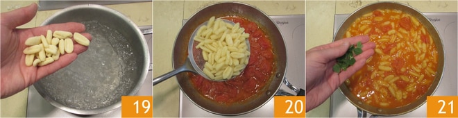 En attendant, mettez une casserole d'eau sur le feu, salez à ébullition et faites cuire les cavatelli 19. Lorsqu'ils remontent à la surface, égouttez les cavatelli dans la poêle avec la sauce 20 et aromatisez avec de l'origan frais 21.