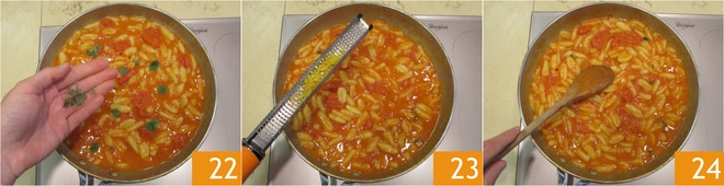 Ajoutez également le thym frais 22 et le zeste de citron râpé 23, puis mélangez bien et faites sauter le tout sur le feu pendant quelques instants 24.