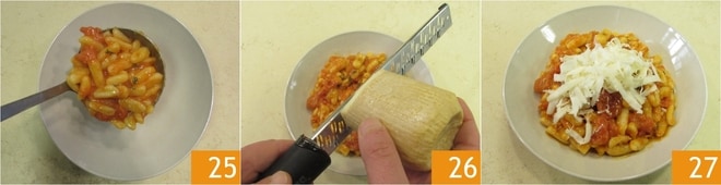 Vous êtes prêts à servir : répartissez les cavatelli ainsi assaisonnés dans les assiettes 25, puis terminez par une généreuse râpée de ricotta fumée 26. Vos cavatelli de pommes de terre avec tomates cerises et ricotta sont prêts à être servis 27 !