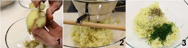 Pour préparer les cazzilli palermitains, commencez par laver et faire bouillir les pommes de terre (de préférence entières avec la peau) dans de l'eau salée, puis égouttez-les et laissez-les refroidir complètement (vous pouvez aussi les cuire la veille). Épluchez les pommes de terre 1 et passez-les au moulin à légumes 2 en veillant à obtenir une purée fine et sans grumeaux. Ajoutez à la purée le sel, le poivre, le persil haché (ou la menthe) 3,