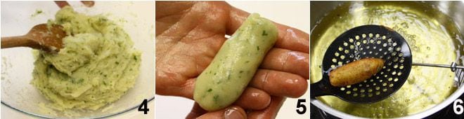 mélangez bien jusqu'à obtenir une pâte homogène 4; huilez vos mains avec de l'huile d'olive, puis prélevez une petite quantité de pâte (vous devez obtenir une croquette de la taille d'un doigt moyen) et formez un cazzillo 5 que vous déposerez sur un plateau. Continuez ainsi jusqu'à épuisement de la pâte. Faites frire les cazzilli dans de l'huile d'olive extra vierge (ou d'arachide) à environ 175°C-180°C (ne dépassez jamais les 180°C). Commencez la friture par un test avec un seul cazzillo 6: s'il devait s'ouvrir ou absorber trop d'huile en restant mou à l'intérieur, il faudra ajouter 2-3 cuillères à soupe de farine, même si la recette originale ne le prévoit pas, car les fritures siciliennes utilisent un type particulier de pommes de terre qui ne nécessite pas cet ajout. Faites frire ensuite tous les cazzilli et servez-les immédiatement!