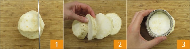 Pour réaliser le céleri-rave avec infusion de bagna cauda, lavez et pelez d'abord le céleri-rave, puis éliminez les imperfections avec un couteau d'office. Coupez le céleri-rave en tranches d'une épaisseur de 2-2,5 cm 1 : vous aurez besoin de 4 tranches uniformes pesant environ 200 g chacune 2. Découpez les tranches avec un emporte-pièce pour obtenir une forme régulière 3.