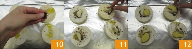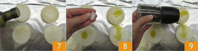 Placez les disques de céleri-rave sur l'une des 2 feuilles d'aluminium et assaisonnez généreusement avec de l'huile 7, du sel 8 et du poivre 9.