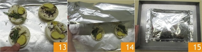 Enfin, parfumez avec une branche de romarin 13. Recouvrez avec l'autre feuille d'aluminium 14 et scellez bien tous les côtés, puis transférez la papillote sur une plaque de cuisson 15. Faites cuire dans un four ventilé préchauffé à 180° pendant 15-20 minutes : une fois que la papillote gonfle, il faudra une dizaine de minutes. Une fois cuit, sortez la papillote du four et laissez reposer pendant 10 minutes.