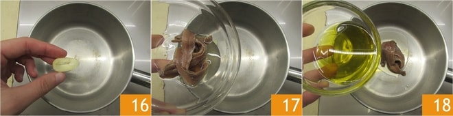 En attendant, préparez la bagna cauda : coupez l'ail en deux et retirez-en le germe, puis mettez-le dans une petite casserole 16 avec les anchois 17 et l'huile 18. Allumez le feu et faites mijoter à feu doux.