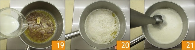 Quand les anchois ne sont pas encore complètement dissous, versez le lait à température ambiante 19 et portez à ébullition. À partir de là, laissez mijoter pendant 7-8 minutes, en remuant de temps en temps 20, puis émulsionnez avec un mixeur plongeant 21.