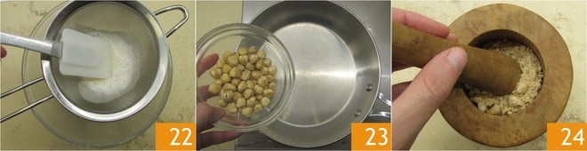 Enfin, filtrez le mélange avec un tamis 22 et remettez-le dans la petite casserole pour le garder au chaud. Versez les noisettes dans une poêle, allumez le feu et faites-les griller pendant 4-5 minutes 23. Écrasez grossièrement les noisettes avec un pilon ou un maillet en ajoutant une pincée de sel 24.