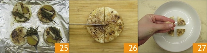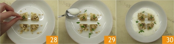 Après le temps de repos, ouvrez la papillote en faisant attention à ne pas vous brûler avec la vapeur, éliminez les assaisonnements 25 et vérifiez la cuisson avec un cure-dent : la consistance doit être fondante. Coupez les tranches de céleri-rave en 4 parties 26 et garnissez avec les noisettes concassées 27.
