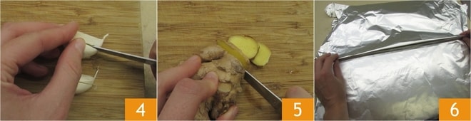 Préparez également les autres ingrédients : coupez les gousses d'ail non pelées en deux dans le sens de la longueur 4, puis lavez et séchez le gingembre et découpez 4 tranches 5. Maintenant, juxtaposiez 2 feuilles d'aluminium et attachez-les ensemble en superposant et repliant l'un des bords 6.