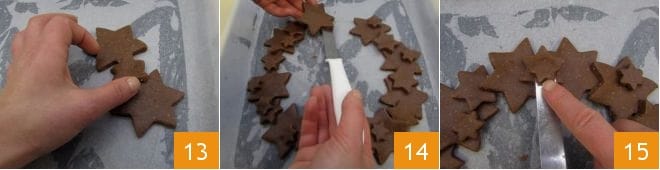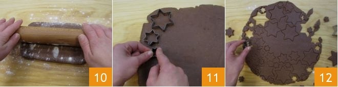Après le temps nécessaire, reprenez le pâton de pâte sablée et étalez-le à une épaisseur de 1 cm sur un plan de travail légèrement fariné 10. Ensuite, découpez avec les formes d'étoiles grandes, moyennes et petites (11-12). Vous pouvez re-pétrir rapidement la pâte sablée et continuer jusqu'à épuisement de la pâte.