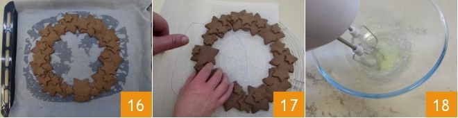 Enfournez dans un four statique préchauffé à 170°C pendant 15 minutes (si four à convection, vous pouvez faire un test en cuisant une étoile de chaque taille et vous ajuster mieux avec les temps et la température, généralement 20°C de moins et 8-10 minutes de moins par rapport au four statique). Quand les étoiles seront cuites 16, transférez-les délicatement sur une grille pour les faire refroidir complètement 17. Pendant ce temps, préparez le glaçage royal : dans un bol, mettez les blancs d'œufs et commencez à les monter avec un batteur électrique 18.