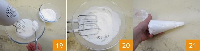 Ensuite, ajoutez peu à peu le sucre glace tamisé 19 et 2 gouttes de citron, jusqu'à obtenir une consistance fluide 20. Transférez le glaçage dans une poche à douille jetable sans embout auquel vous pouvez faire un petit trou à la pointe 21.