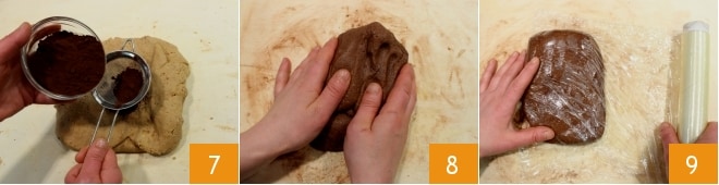 Saupoudrez le pâton de pâte sablée avec le cacao amer tamisé 7 et amalgamez-le à la pâte 8. Maintenant que vous avez obtenu un pâton lisse et compact, aplatissez-le légèrement et enveloppez-le dans du film alimentaire 9 : laissez-le reposer au moins 30 minutes au réfrigérateur.