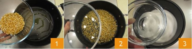 Pour réaliser les cerveaux d'Halloween, commencez par préparer le pop-corn : dans une grande poêle, versez un filet d'huile et le maïs 1. Couvrez avec un couvercle 2 et, à feu moyen, attendez que les grains de maïs commencent à éclater. Cette opération prendra environ 10 minutes. Secouez la poêle de temps en temps pour éviter qu'ils ne brûlent. Pendant ce temps, préparez le sirop de glucose en mettant 250 g de sucre et 50 g d'eau dans une petite casserole 3