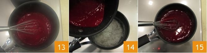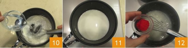 Ajoutez 125 g d'eau en filet en mélangeant avec un fouet 10, pour éviter la formation de grumeaux. Portez la casserole sur le feu 11 et laissez frémir sans cesser de remuer avec le fouet. Une fois frémissant, ajoutez le colorant 12