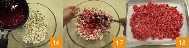 Versez le pop-corn dans un bol, salez et ajoutez le mélange coloré 16 et mélangez pour donner une belle couleur rouge au pop-corn 17. Versez le pop-corn sur un plateau recouvert de papier sulfurisé et répartissez-le uniformément 18.
