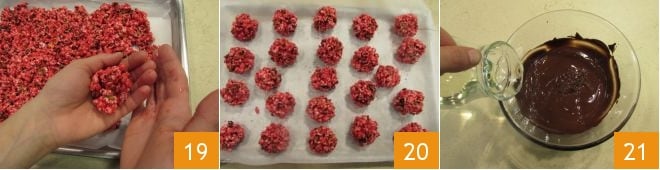 Mettez le plateau au réfrigérateur et laissez refroidir votre pop-corn pendant au moins 20/30 minutes. Une fois bien froids, prélevez des portions de pop-corn avec une cuillère à soupe et formez grossièrement des boules 19, pour cela, munissez-vous d'un bol d'eau pour vous humidifier les mains avant de former les boules. Une fois les boules formées, posez-les sur le plateau recouvert de papier sulfurisé 20 -bien espacées- et laissez-les raffermir au congélateur pendant au moins 40 minutes -de cette façon, il sera beaucoup plus facile de les glacer-. Faites fondre le chocolat haché au micro-ondes et émulsionnez-le avec l'huile végétale 21