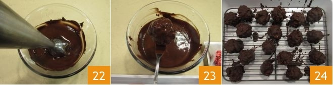 en utilisant un mixeur plongeant 22. Après 40 minutes, vous pouvez enfin glacer vos mini cerveaux : aidez-vous d'une fourchette, trempez-les dans le chocolat 23 et posez-les sur une grille sous laquelle vous aurez mis un plateau. Cette opération vous permettra d'éliminer l'excès de chocolat. Laissez refroidir vos mini cerveaux au frigo pendant au moins 30 minutes, après le temps de raffermissement, vos mini cerveaux seront prêts à être dégustés 24.