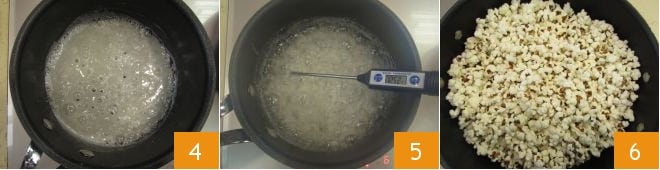 Quand le sucre sera dissous et que le mélange commencera à bouillir 4, contrôlez la température avec un thermomètre et retirez du feu lorsqu'il atteindra une température de 125 degrés. 5 Cette opération prendra environ 10 minutes. Pendant ce temps, le pop-corn sera prêt 6, mettez-le de côté pour qu'il refroidisse