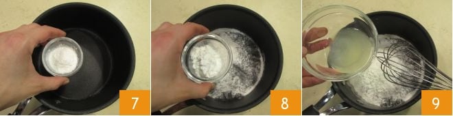 Entre-temps, dans une autre casserole, versez l'amidon de maïs 7, la gélatine en poudre 8 et le jus de citron 9.