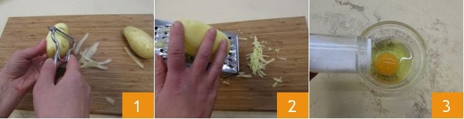 Pour préparer les paniers de pommes de terre farcis au saumon, commencez par l'enveloppe des paniers. Prenez les pommes de terre et après les avoir lavées et séchées, épluchez-les 1. Ensuite, à l'aide d'une râpe à gros trous, râpez-les 2 et versez-les dans un grand bol. Cassez l'œuf dans un petit bol, salez 3 et poivrez, puis battez-le avec une fourchette.