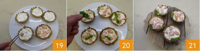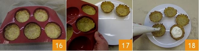 À ce stade, vos paniers de pommes de terre seront prêts : sortez-les du four 16 et laissez-les refroidir. Lorsqu'ils sont à température ambiante, démoulez-les et déposez-les sur une assiette 17. Remplissez-les avec la crème de fromage 18.