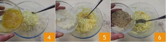 Ajoutez l'œuf aux pommes de terre 4. Ajoutez ensuite le fromage râpé 5 et la farine de noisette 6. Mélangez bien les ingrédients avec une cuillère jusqu'à obtenir un mélange homogène.