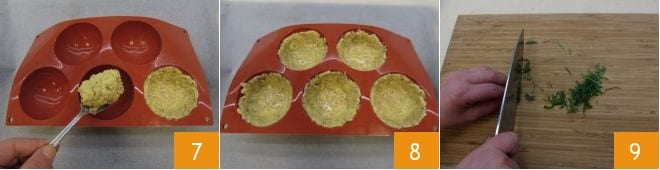 Versez le mélange obtenu dans 6 moules en silicone d'une capacité de 100 g 7. Appuyez bien le mélange sur les bords du moule à l'aide d'une cuillère : le mélange doit prendre la forme du moule et rester creux à l'intérieur. Une fois préparés 8, enfournez-les dans un four statique préchauffé à 220°C pendant 20 minutes (ou dans un four ventilé à 200°C pendant 10 minutes). Pendant que vos paniers cuisent, préparez la mousse de fromage pour la garniture : hachez finement la menthe, en laissant quelques feuilles entières pour la décoration finale 9.