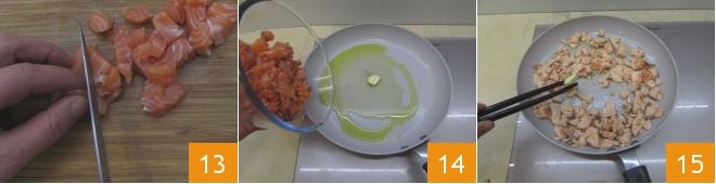 Coupez le saumon en lanières puis en dés d'environ 1 cm de côté 13. Chauffez l'huile dans une poêle antiadhésive et faites rissoler l'ail 14. Faites revenir le saumon pendant environ 2-3 minutes, jusqu'à ce qu'une légère croûte se forme à la surface. Salez et poivrez. Enfin, retirez l'ail 15 et laissez tiédir le saumon, si vous préférez, en le plaçant dans un bol.