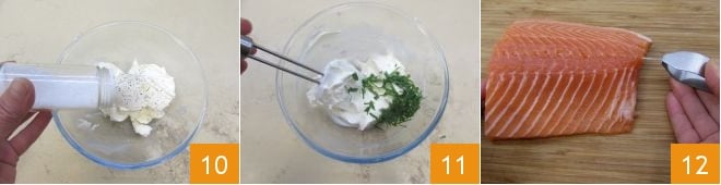 Versez ensuite le Philadelphia dans un bol, salez 10 et poivrez. Puis ajoutez les feuilles de menthe hachées et mélangez bien tous les ingrédients 11. Transférez le mélange dans une poche à douille et mettez de côté. Ensuite, occupez-vous du saumon : retirez les arêtes à l'aide d'une pince de cuisine 12 et la peau, si elle est présente, avec la lame d'un couteau.