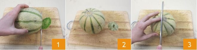 Pour préparer les paniers de jambon et melon, il faut d'abord sculpter les melons pour en faire de petits contenants que nous remplirons ensuite. Commencez par couper une rondelle sur le dessus du melon 1. Maintenant, retournez-le, en le posant sur la partie coupée 2 qui sera ainsi plus stable. Procédez maintenant à la découpe de ce qui deviendra bientôt la poignée du panier. Réalisez sur le sommet du fruit, à environ 1,5 cm du pédoncule, une coupe profonde qui s'enfonce jusqu'à la moitié du melon 3.